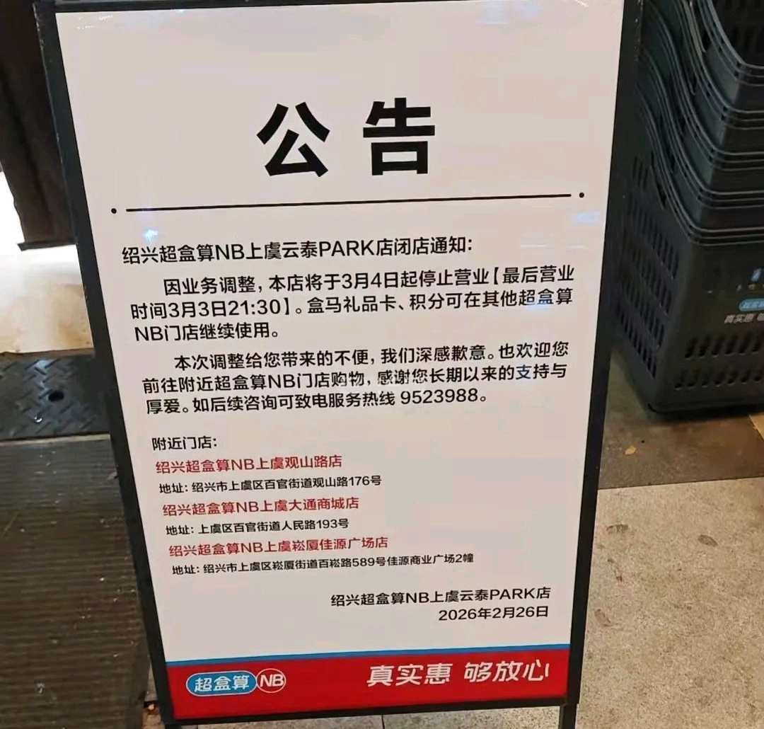 | 近日,位于紹興上虞區(qū)云泰PARK一層的超盒算NB(原盒馬NB)貼出閉店公告稱,因業(yè)務(wù)調(diào)整,將于3月4日正式停止?fàn)I業(yè)。公告顯示,持有盒馬禮品卡和積分的顧客可在上虞其他三家門店(觀山路店、大通商城店、崧廈佳源廣場(chǎng)店)繼續(xù)使用。目前,店內(nèi)商品正在進(jìn)行最后的清倉(cāng)處理。據(jù)悉,該店于2025年7月25日開(kāi)業(yè),至今僅半年多時(shí)間。雖然地處上虞城北黃金地段,但位置極為特殊——緊鄰人氣爆棚的萬(wàn)和城,且與對(duì)面的新大通盒馬鮮生僅相距幾百米,競(jìng)爭(zhēng)異常激烈。有業(yè)內(nèi)人士認(rèn)為,這并非簡(jiǎn)單的經(jīng)營(yíng)失敗,更像是品牌在"試錯(cuò)"后的果斷"止損"。(越牛新聞) |