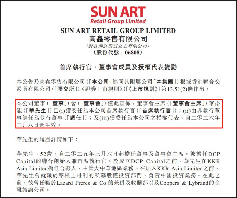 3月8日,大潤發(fā)母公司高鑫零售在港交所發(fā)布公告,宣布董事會主席華裕能已被委任為公司首席執(zhí)行官,自2026年3月8日起生效。同時,華裕能由非執(zhí)行董事調(diào)任為執(zhí)行董事,并獲委任為公司的授權(quán)代表。 公告顯示,因原高鑫零售執(zhí)行董事、首席執(zhí)行官李衛(wèi)平至今仍未能取得聯(lián)絡(luò),其于一段長時間內(nèi)在未請假情況下,未能履行其職責(zé),董事會已議決免除李衛(wèi)平作為本公司執(zhí)行董事之職務(wù),自2026年3月8日起實(shí)時生效,李衛(wèi)平亦不再擔(dān)任本公司首席執(zhí)行官及授權(quán)代表,但其仍將繼續(xù)為本集團(tuán)之雇員。 公開信息顯示,李衛(wèi)平于2025年12月1日加入高鑫零售,擔(dān)任高鑫零售執(zhí)行董事兼首席執(zhí)行官一職。更具雙方簽訂的三年服務(wù)協(xié)議,其固定年薪為336萬元,且有權(quán)享有年度管理層花紅,具體金額由公司薪酬委員會及董事會根據(jù)經(jīng)營業(yè)績及個人表現(xiàn)決定。 作為擁有26年零售行業(yè)經(jīng)驗(yàn)的資深從業(yè)者,李衛(wèi)平曾在華潤超市、樂天超市任職,2018年加入盒馬后,先后擔(dān)任華北北京大區(qū)總經(jīng)理、盒馬鮮生CEO、首席商品官等重要職務(wù)。憑借線上線下融合的運(yùn)營經(jīng)驗(yàn),高鑫零售對其寄予厚望,希望其推動集團(tuán)三年戰(zhàn)略落地,助力大潤發(fā)擺脫業(yè)績困境。 然而,從任職到被免職僅三個多月。對于其突然失聯(lián),市場普遍認(rèn)為或與此前在盒馬任職期間的相關(guān)事項(xiàng)有關(guān),與高鑫零售自身業(yè)務(wù)無關(guān)。 此次接任CEO的華裕能現(xiàn)年52歲,自2025年3月6日起擔(dān)任高鑫零售董事及董事會主席,具備豐富的資本運(yùn)作和企業(yè)管理經(jīng)驗(yàn)。履歷顯示,華裕能是DCP Capital(德弘資本)的聯(lián)合創(chuàng)始人兼首席執(zhí)行官,此前曾任職于KKR Asia Limited擔(dān)任合伙人,主管大中華地區(qū)業(yè)務(wù),還曾在摩根士丹利私募股權(quán)投資部門、Lazard Freres & Co.兼并及收購部、Coopers & Lybrand金融咨詢公司任職。其深厚的資本背景和行業(yè)資源,或?qū)楦喏瘟闶鄣霓D(zhuǎn)型注入新的動力。 業(yè)內(nèi)人士分析,高鑫零售此次快速任命華裕能接任,核心是為了保障企業(yè)運(yùn)營的穩(wěn)定性,避免人事動蕩進(jìn)一步影響業(yè)績復(fù)蘇。 |