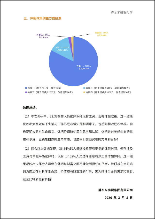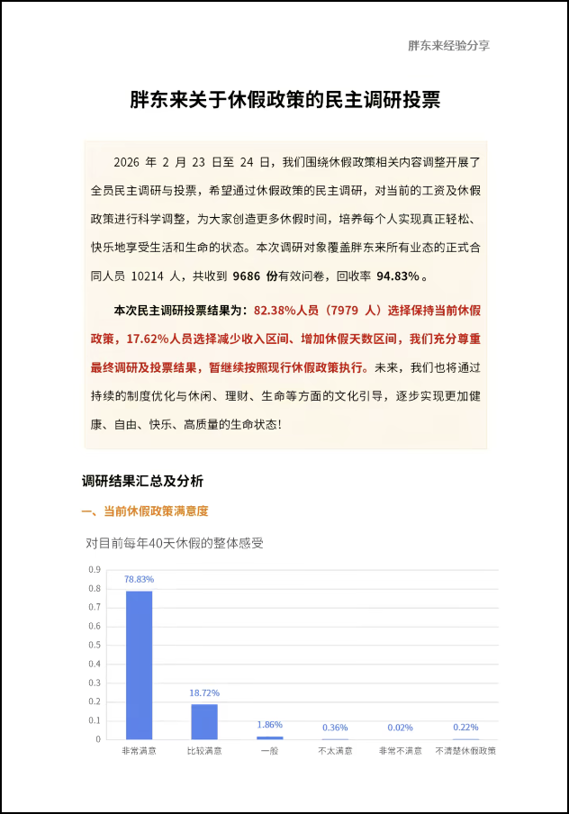 3月8日,胖東來官方賬號在社交平臺發(fā)布《關(guān)于休假政策的民主調(diào)研投票》結(jié)果,直接刷屏社交平臺,相關(guān)話題火速沖上熱搜。 本次調(diào)研于2026年2月23日至24日進行,圍繞休假政策相關(guān)內(nèi)容調(diào)整開展了全員民主調(diào)研與投票,調(diào)研對象覆蓋胖東來所有業(yè)態(tài)的正式合同人員10214人,共收到9686份有效問卷,問卷回收率94.83%。 為了滿足不同員工的需求,胖東來貼心設(shè)計了4套梯度方案供自主選擇:方案一:維持現(xiàn)有工資與休假(每日7小時工作制、每年40天帶薪年假)方案二:每月降薪500元,年休假增加10天方案三:每月降薪1000元,年休假增加20天方案四:每月降薪1500元,年休假增加30天。 一位胖東來一線員工坦言:"現(xiàn)在工資夠養(yǎng)家,每天工作7小時不累,40天年假也足夠陪孩子、照顧老人,沒必要為了多幾天假少拿錢,安穩(wěn)踏實才是最實在的。"這番話道出了多數(shù)人的心聲。 調(diào)研報告顯示,面對四個不同梯度的“降薪增假”方案,高達82.38%(7979人)的員工投票選擇了“方案一”,即維持現(xiàn)有的工資與休假制度不變。另外17.62%的員工則選擇了不同程度的降薪增假方案,例如月工資減少500元、休假增加10天等。 胖東來調(diào)研投票的數(shù)據(jù)顯示,有97.55%的員工對目前每年40天的休假安排感到“非常滿意”或“比較滿意”;同時,約94%的員工對當前每天7小時的工作時間及安排感到滿意。 此外,若保證效率與健康的前提下,實現(xiàn)科學(xué)的工作時間,約50%的員工認為需保持目前的平均每天7小時工作制,約44%員工認為可縮減1小時,實現(xiàn)6小時,5%左右人員認為能夠持續(xù)實現(xiàn)更少工時。 胖東來調(diào)研數(shù)據(jù)總結(jié)稱,82.38%的人選擇保持現(xiàn)有工資、現(xiàn)有休假政策,這一結(jié)果反映出大家對當下生活與工作已經(jīng)非常知足和滿意了,也感到相對輕松幸福。但也說明大家對生命意義、休閑價值缺少深入思考和認知,休閑是對美好生命的尊重和享受,應(yīng)當是自然的生命常態(tài),也是我們鼓勵實現(xiàn)的方向和目標! 值得注意的是,36.8的人員希望擁有更多的休假時間,但是涉及工資與休假平衡選擇時,僅有17.62%人員選擇愿意減少工資增加休假。這一結(jié)果反映出少部分人員在休閑與財富之間不能做到很好的平衡,公司將在后續(xù)培訓(xùn)中加強對科學(xué)生命觀、價值觀的引導(dǎo)。 最終,胖東來商貿(mào)集團宣布,將尊重這17.62%員工的選擇,同時也繼續(xù)按照現(xiàn)行休假政策執(zhí)行。 此外,當天,胖東來創(chuàng)始人于東來再次在社交平臺分享胖東來經(jīng)驗。他稱,胖東來從2000年開始把利潤按崗位分配給全體職工,讓員工得到尊重和關(guān)心、產(chǎn)生信任。目的是激發(fā)大家的積極思維力和創(chuàng)造力,再啟發(fā)大家學(xué)習(xí)追求踐行科學(xué)美好生活的方式。 于東來此次公開的資產(chǎn)分配明細顯示,胖東來集團合計員工10194人,資產(chǎn)總額379290萬元(約37.93億元)。其中:管理團隊:共718人,占集團總?cè)藬?shù)7.0%,對應(yīng)資產(chǎn)151410萬元,占比39.9%,涵蓋店長、店助、處長等層級;技術(shù)團隊:共563人,占集團總?cè)藬?shù)5.5%,對應(yīng)資產(chǎn)46820萬元,占比12.3%;一線員工:共8913人,占集團總?cè)藬?shù)87.4%,對應(yīng)資產(chǎn)181060萬元,占比47.7%,其中普通員工8633人,以人均20萬元的標準分配資產(chǎn),占集團資產(chǎn)總額的45.5%。 于東來還表示,未來這約40億元資產(chǎn)將作為公司股本,管理團隊與員工各占約50%權(quán)益,每年利潤的50%用于團隊獎金、50%歸股東收益。 |