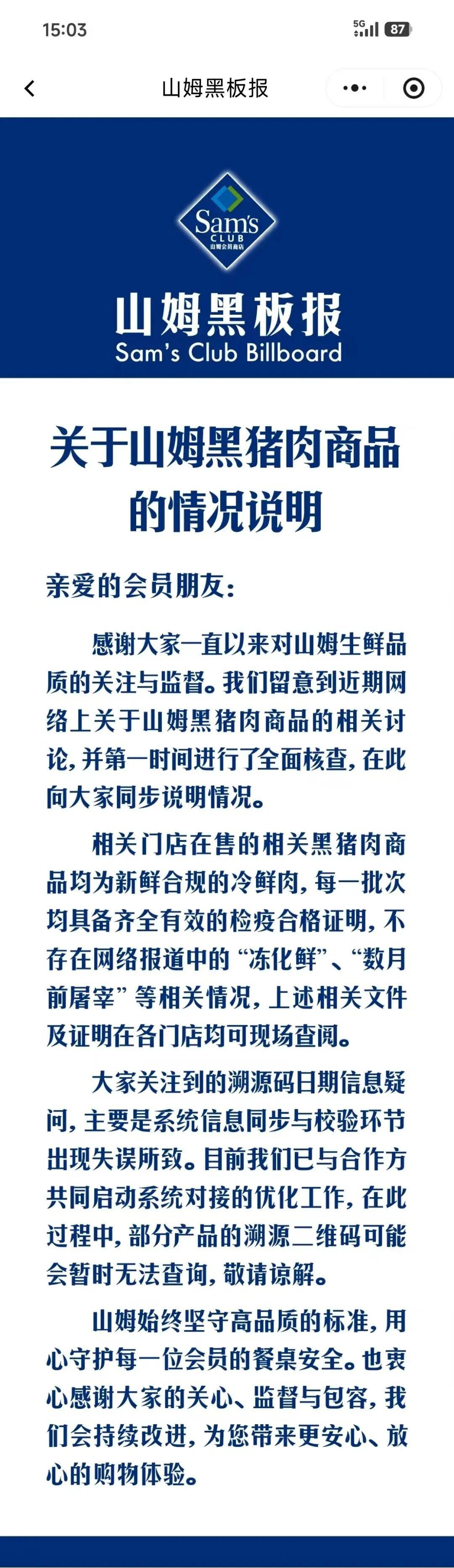 近日,話題“山姆被曝冷鮮豬肉是數(shù)月前屠宰的”沖上熱搜。 3月22日,山姆發(fā)布《關(guān)于山姆黑豬肉商品的情況說明》回應(yīng)豬肉溯源碼因系統(tǒng)同步失誤。 聲明中表示,感謝大家一直以來對山姆生鮮品質(zhì)的關(guān)注與監(jiān)督。我們留意到近期網(wǎng)絡(luò)上關(guān)于山姆黑豬肉商品的相關(guān)討論,并第一時間進行了全面核查,在此向大家同步說明情況。 相關(guān)門店在售的相關(guān)黑豬肉商品均為新鮮合規(guī)的冷鮮肉,每一批次均具備齊全有效的檢疫合格證明,不存在網(wǎng)絡(luò)報道中的“凍化鮮”、“數(shù)月前屠宰"等相關(guān)情況,上述相關(guān)文件及證明在各門店均可現(xiàn)場查閱。 大家關(guān)注到的溯源碼日期信息疑問,主要是系統(tǒng)信息同步與校驗環(huán)節(jié)出現(xiàn)失誤所致。目前我們已與合作方共同啟動系統(tǒng)對接的優(yōu)化工作,在此過程中,部分產(chǎn)品的溯源二維碼可能會暫時無法查詢,敬請諒解。 此前報道 據(jù)媒體報道,3月19日,廣東深圳網(wǎng)友姜女士在社交平臺發(fā)帖稱,自己3月18日在深圳山姆會員商店購買了黑豬瘦肉,回家后掃描包裝上的二維碼,進入“山姆區(qū)塊鏈食品安全追溯系統(tǒng)”,發(fā)現(xiàn)頁面顯示的“活豬接收日期”和“屠宰日期”均為2025年11月9日。 山姆工作人員表示可以辦理退貨,并解釋稱“冷鮮肉有120天保質(zhì)期”。姜女士繼續(xù)追問后,對方改口稱“是溯源碼沒有更新”。更讓姜女士不解的是,19日她再次掃碼時,發(fā)現(xiàn)頁面上的“食品追溯信息”已經(jīng)消失。姜女士質(zhì)疑,山姆是在銷售解凍后的冷凍肉產(chǎn)品。 3月22日,山姆回應(yīng)豬肉溯源碼因系統(tǒng)同步失誤,不存在網(wǎng)絡(luò)報道中的“凍化鮮”、“數(shù)月前屠宰"等相關(guān)情況,上述相關(guān)文件及證明在各門店均可現(xiàn)場查閱。 |