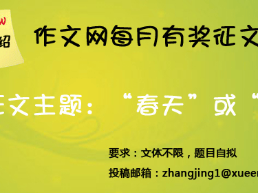歡迎大家來到作文網(wǎng)(www.zhenyuwo.cn)每月征文活動專區(qū),在這里,你可以遨游在浩瀚豐富的作文寶庫,盡情品味精彩文章,提升寫作水平,讓進步伴隨你的左右。每月參與一次征文活動,在輕松的寫作中體味快樂,在作文的海洋展示文學才華,不要再把作文拘泥于任務,讓我們用手中的筆,記錄下每一次成長的快樂吧! 本月征文主題“春天”或“開學感受”,作文體裁不限、字數(shù)不限!都說一年之計在于春,一日之季在于晨,嶄新的2010年春天已經(jīng)向我們迎面而來了,快拿起您的筆,告訴我們,你期盼的春天是什么樣子?春天來了,新學期開始了。許多同學一定會有新的打算、新的希望、新的目標。快來暢所欲言告訴我們你的展望!您的來稿會發(fā)布到學而思作文網(wǎng)(點擊進入),我們還有權(quán)威的專家給你點評,期待廣大網(wǎng)友和同學們積極參與!獲獎文章有可能被雜志采納哦! |