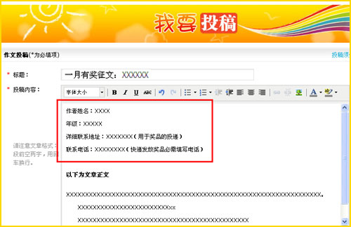 備注: 1)文章必須是作者原創(chuàng),文體不限,字?jǐn)?shù)不限。 2)個(gè)人來(lái)稿不限數(shù)量,每一份來(lái)稿都有機(jī)會(huì)參與評(píng)獎(jiǎng)。 3)來(lái)稿不得侵犯他人的著作權(quán),如有糾紛將由投稿人承擔(dān)相關(guān)責(zé)任。 4)參賽作品須在標(biāo)題前面加上“一月有獎(jiǎng)?wù)魑摹弊謽,否則當(dāng)普通文章處理。 5)參賽作品須在題目下面注明作者姓名、年級(jí)、聯(lián)系電話、詳細(xì)聯(lián)系地址,否則取消評(píng)獎(jiǎng)資格。 6)本次征文活動(dòng)最終解釋權(quán),歸作文網(wǎng)所有。